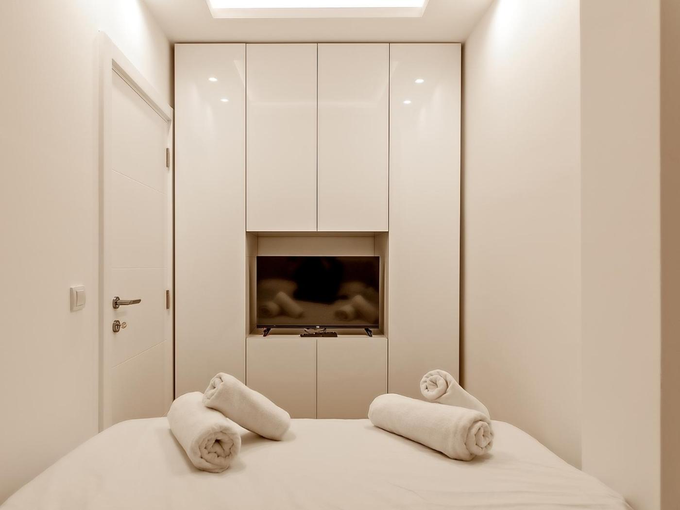 Studio Apartment. Featuring a private entrance, this air-conditioned apartment consists of 1 living room, 1 separate bedroom and 1 bathroom with a walk-in shower and a hairdryer. Guests can make meals in the kitchen that is equipped with a stovetop, a refrigerator, kitchenware and a microwave. Boasting a terrace with ancourtyard view, this apartment also provides soundproof walls and a flat-screen TV with cable channels. The unit offers 1 bed. ;