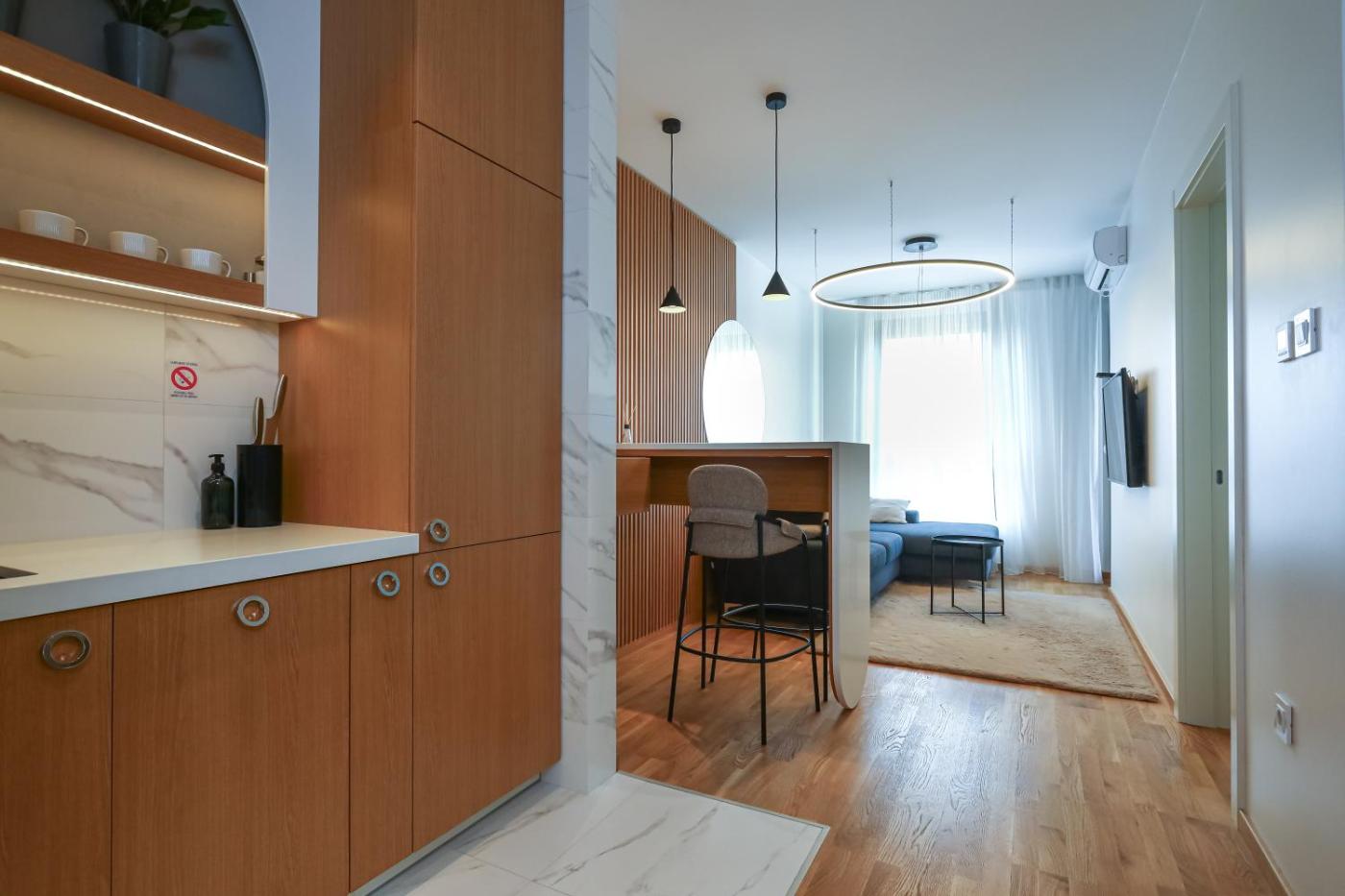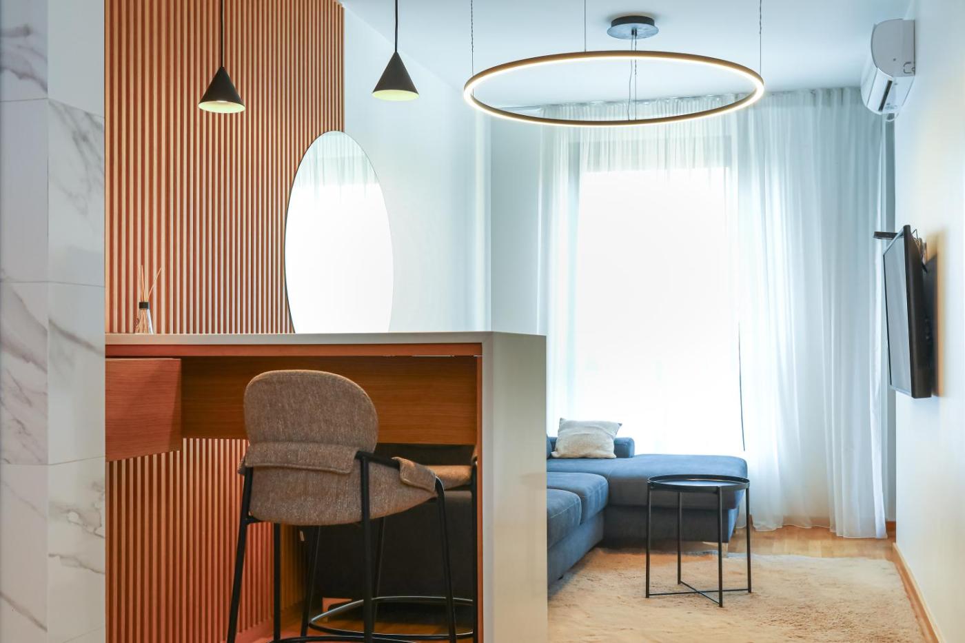 One-Bedroom Apartment. The air-conditioned apartment has 1 bedroom and 1 bathroom with a walk-in shower and a hairdryer. The well-equipped kitchen features a stovetop, a refrigerator, a dishwasher and kitchenware. Boasting a terrace with city views, this apartment also features a washing machine and a flat-screen TV. The unit has 1 bed.